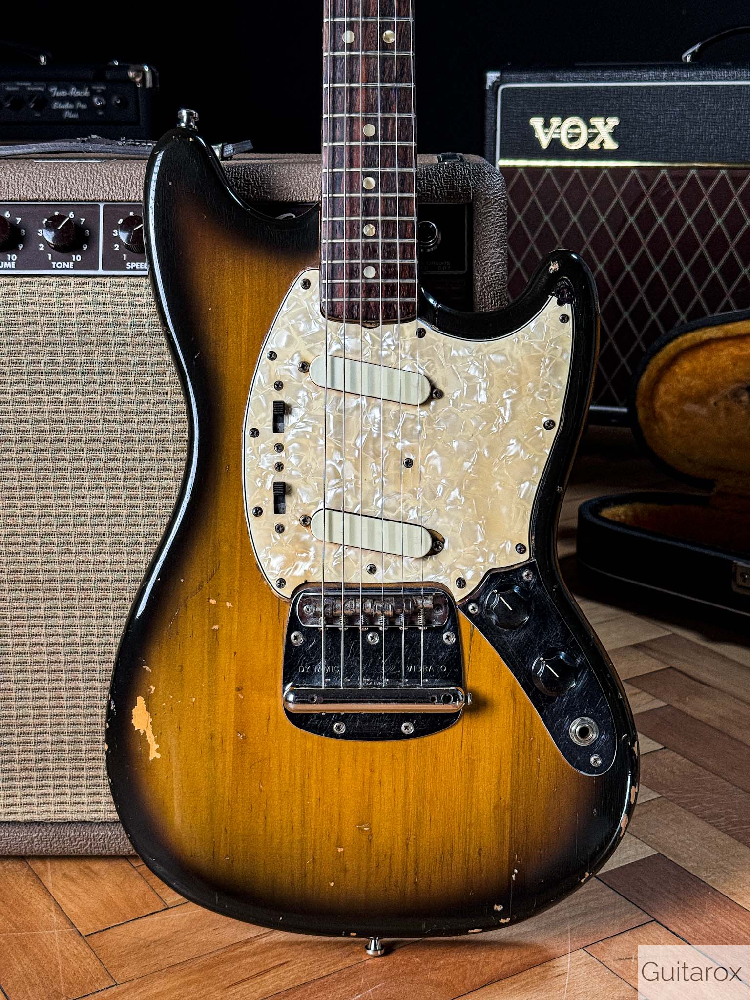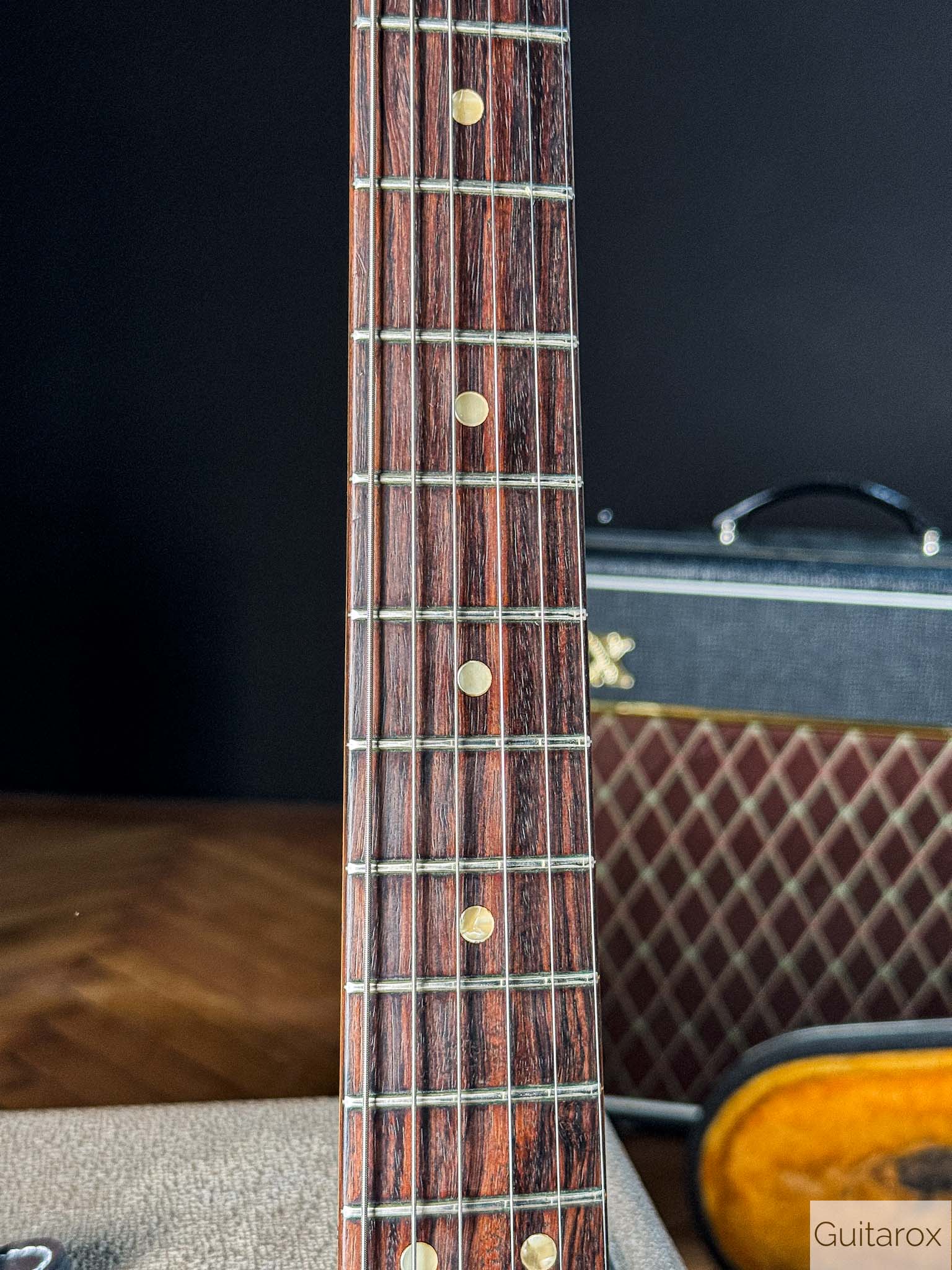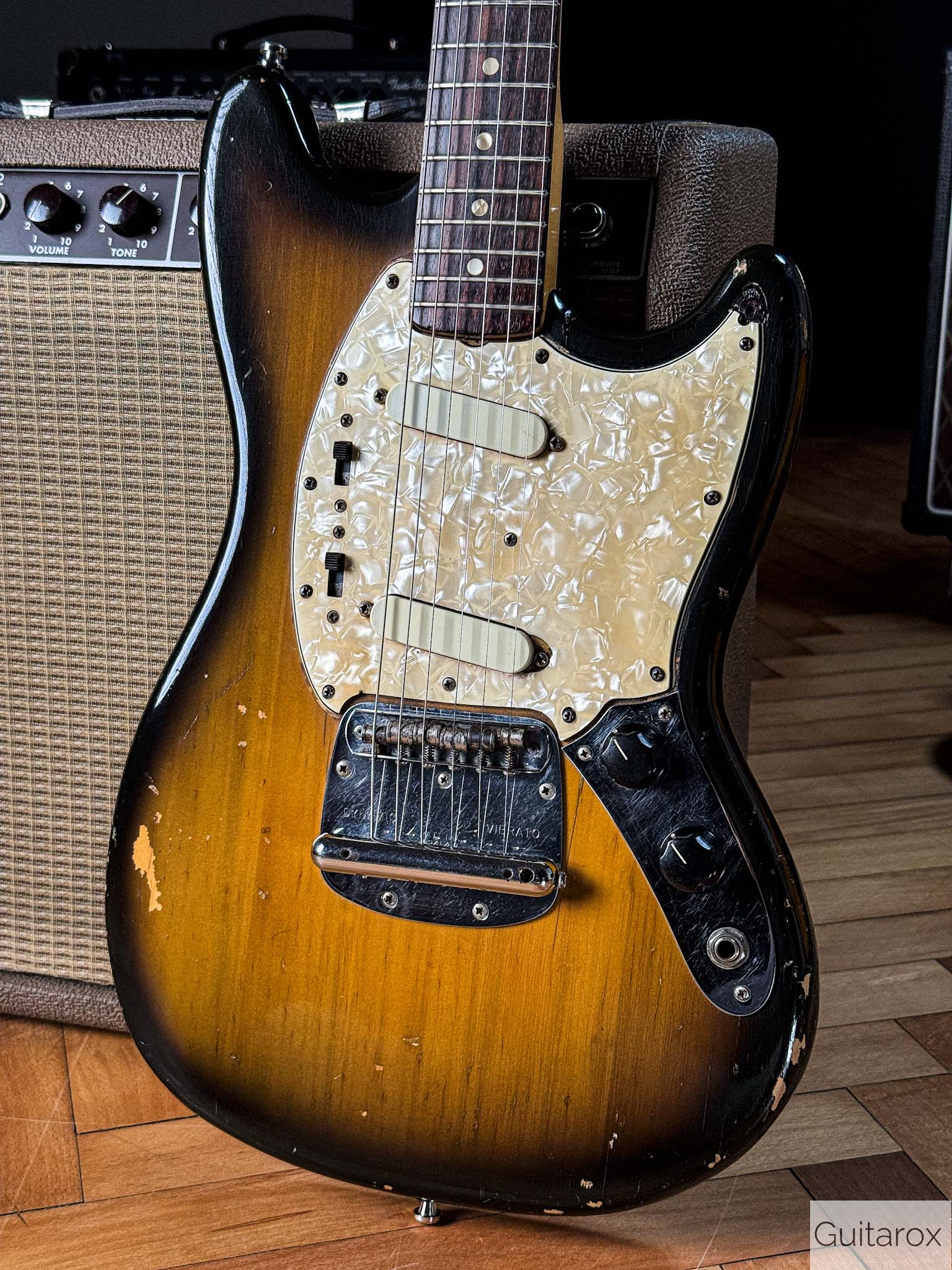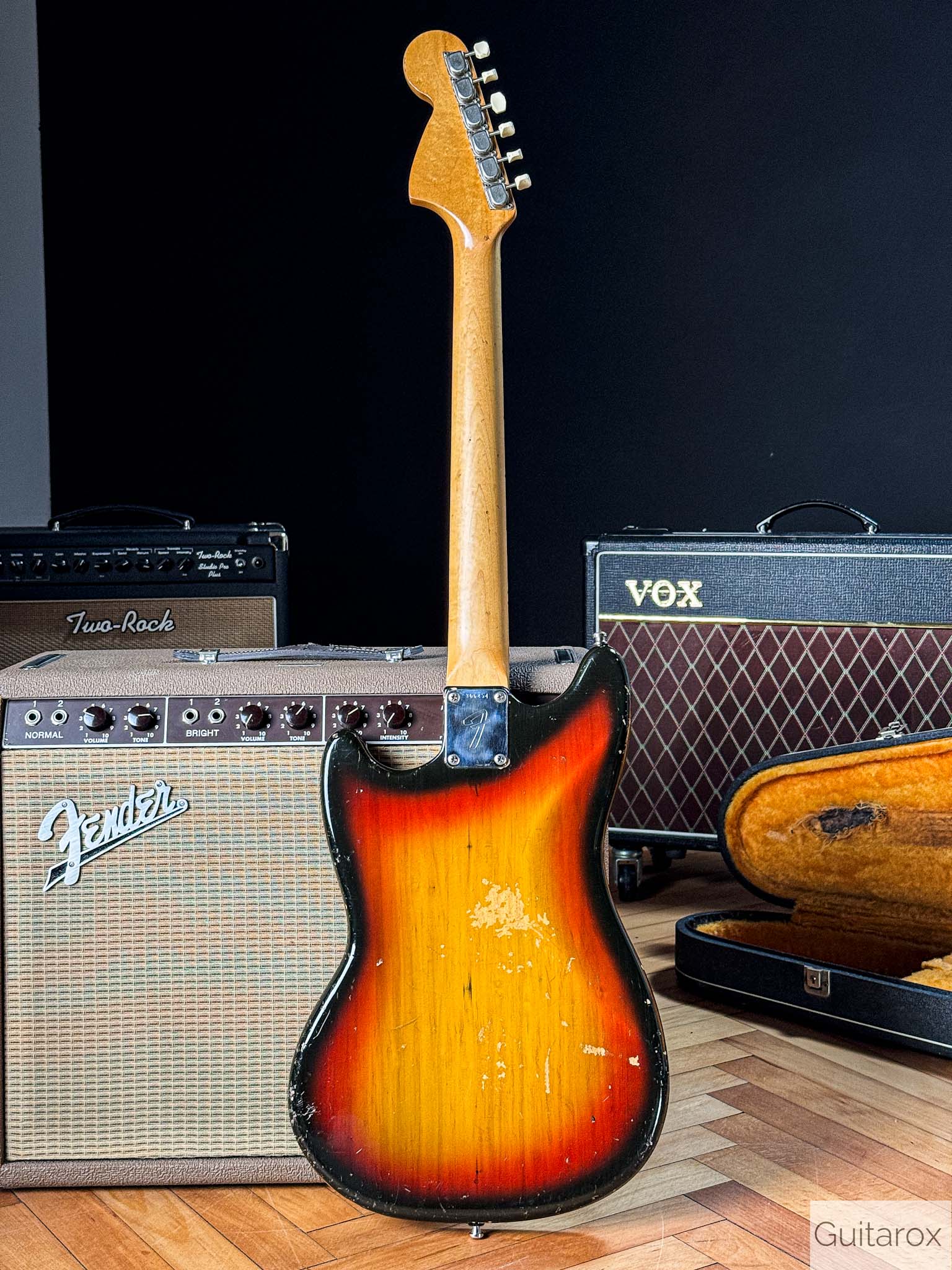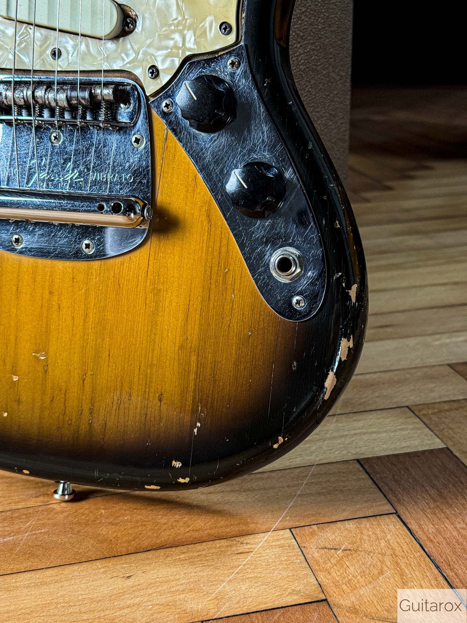 Die Gitarre besticht durch ihren unverwechselbaren Vintage-Charakter. Der Hals mit dem Datumsstempel vom März 1972 liegt angenehm in der Hand und bietet das typische Spielgefühl, das man nur von eingespielten Instrumenten aus dieser Ära kennt. Die Mustang ist bekannt für ihre Vielseitigkeit – von bissigen Leadsounds bis hin zu perkussiven Rhythmus-Texturen.