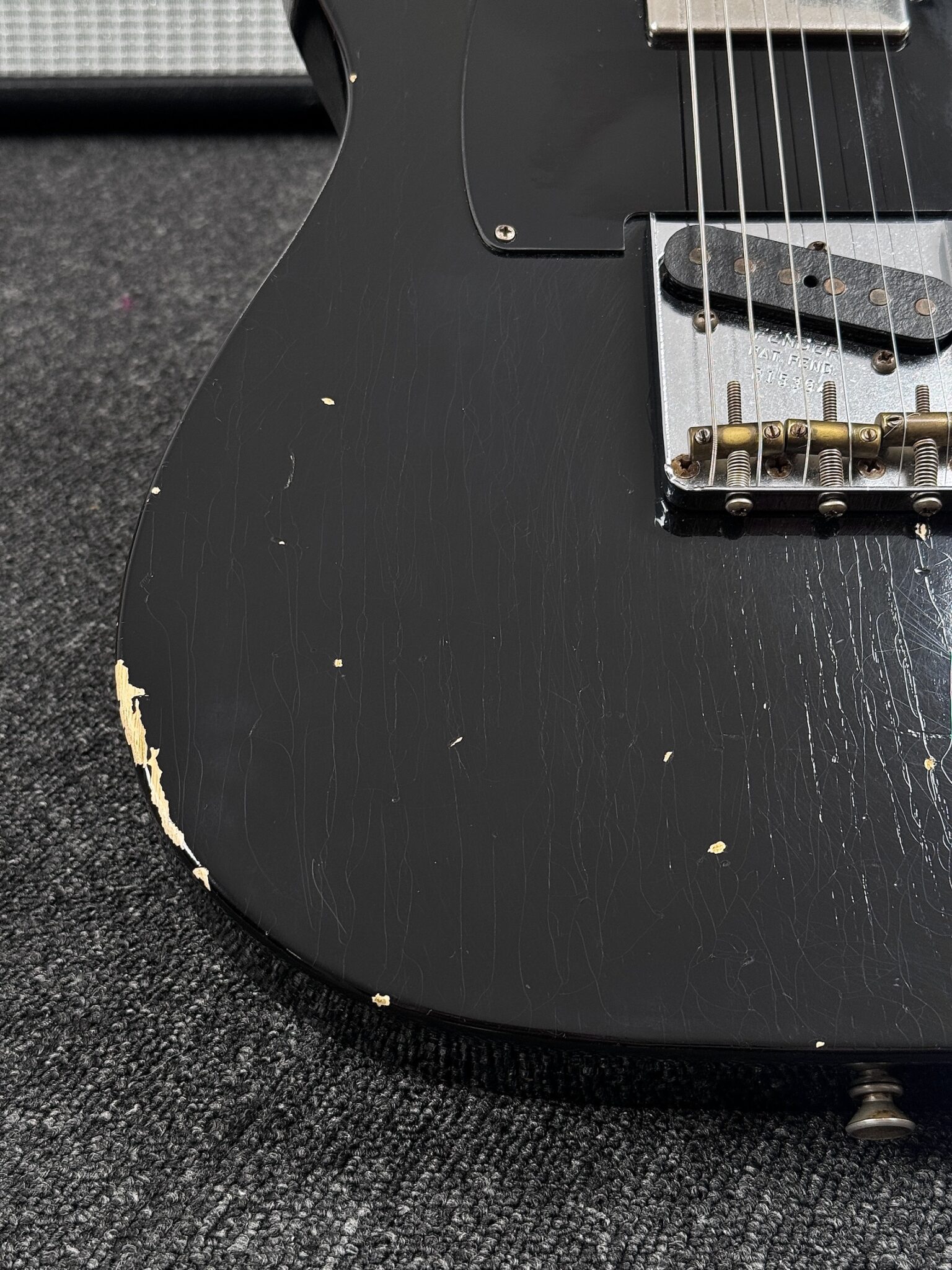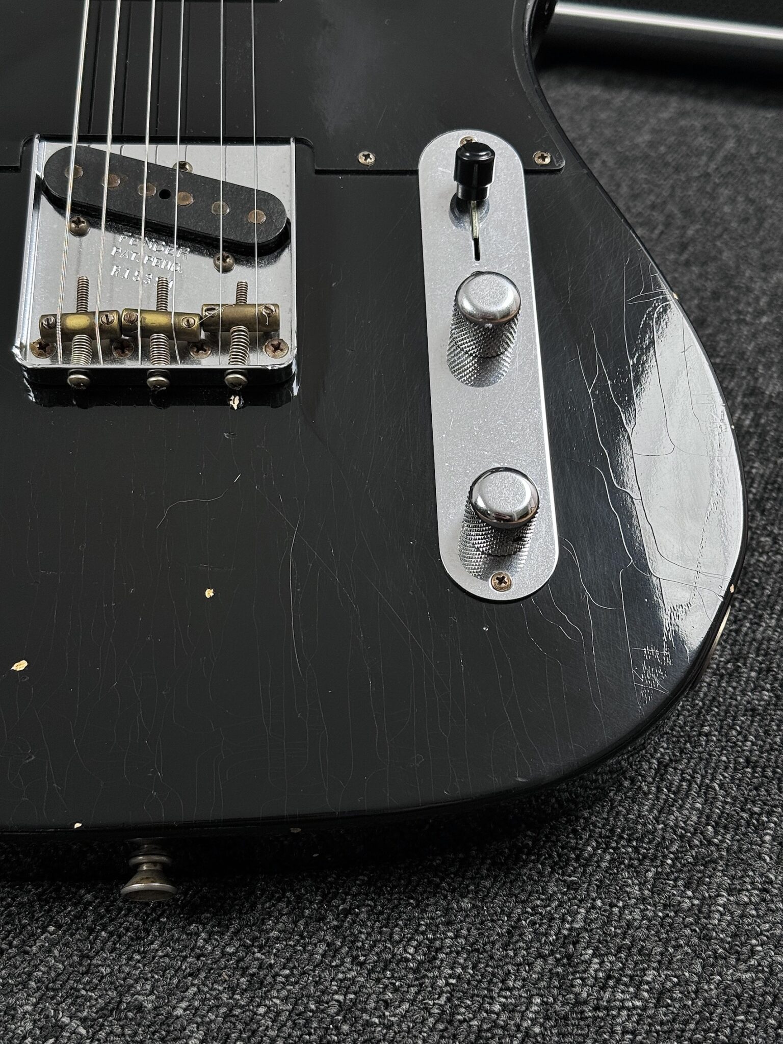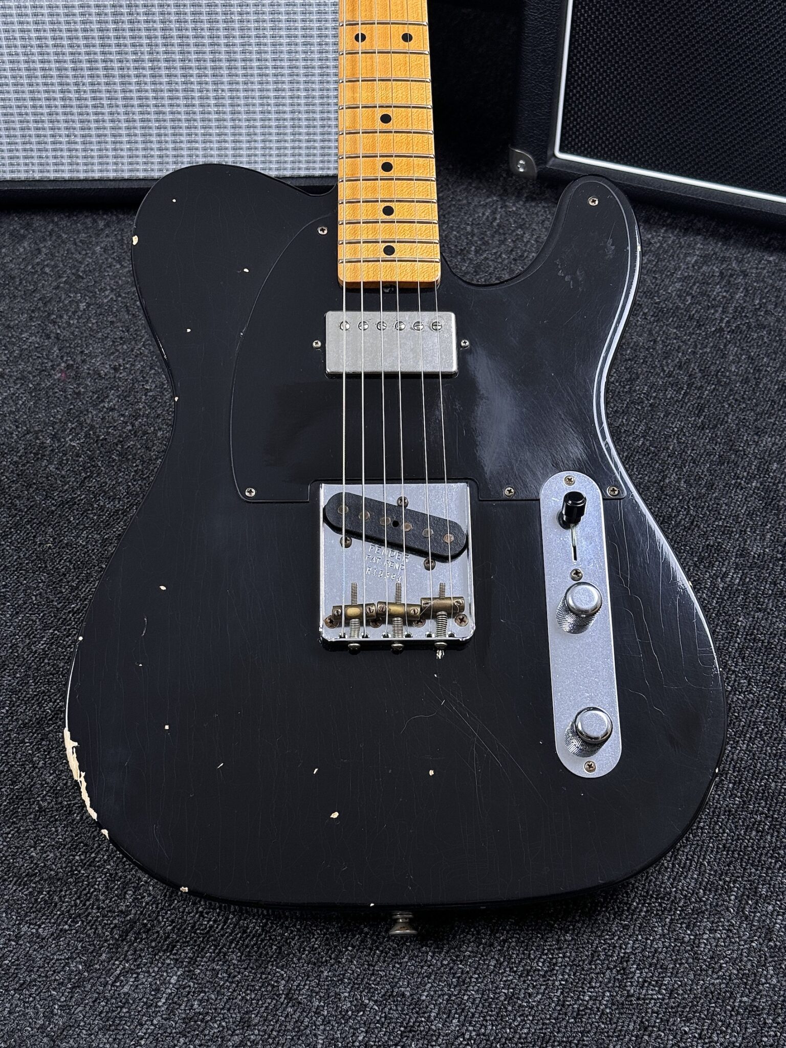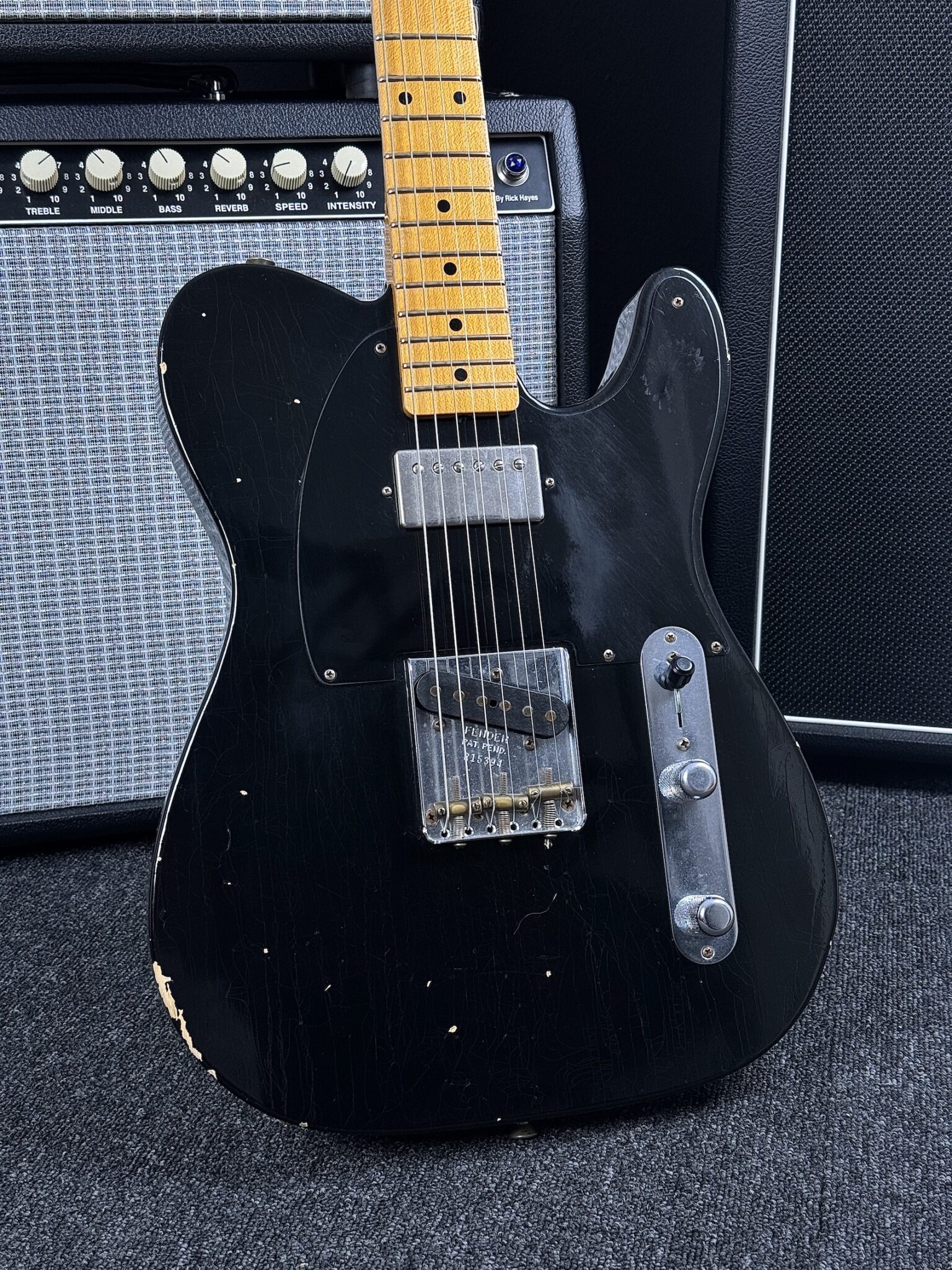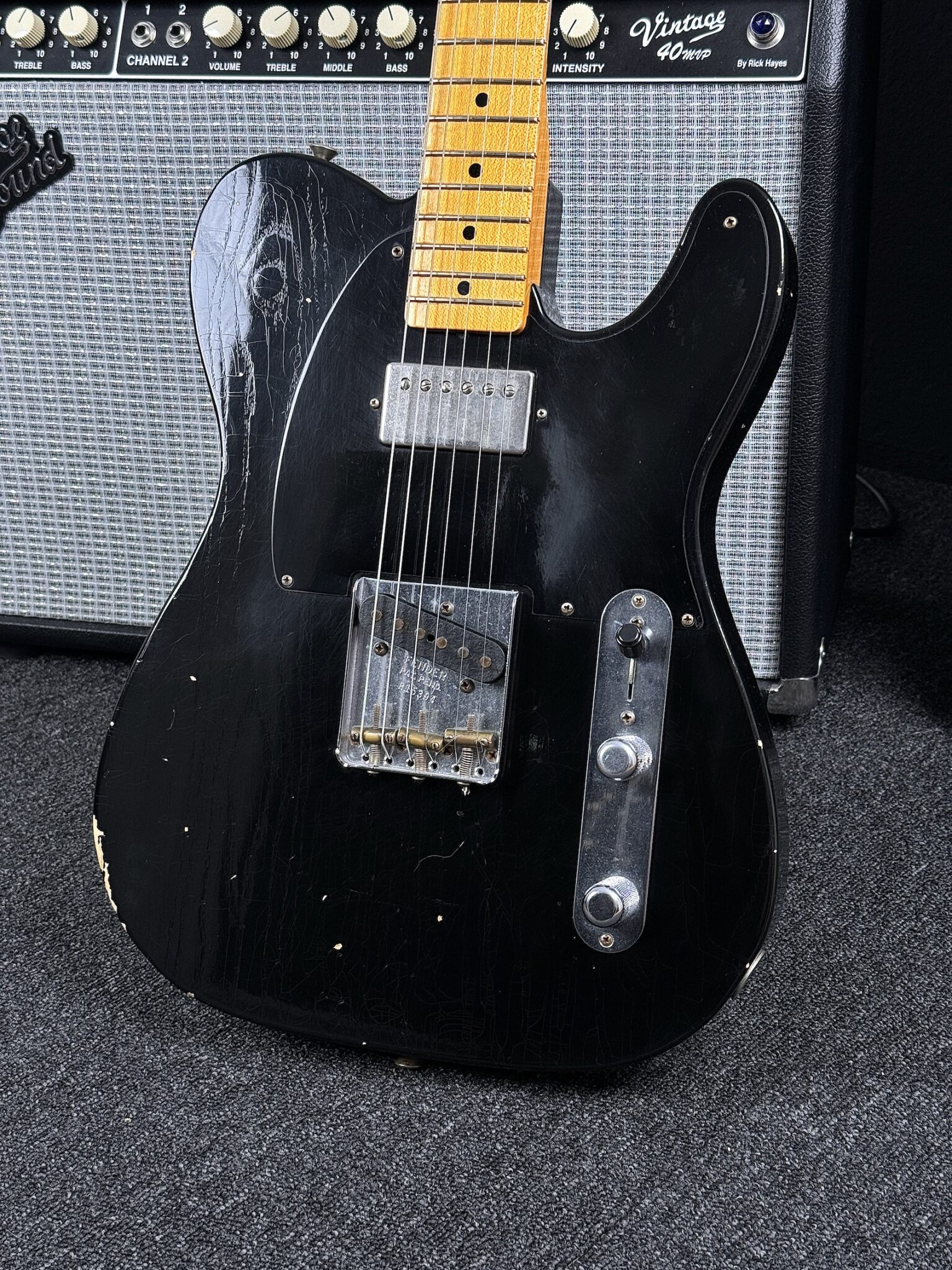 Die Tele wurde auf Kundenwunsch angefertigt – mit coolen Specs! Wir persönlich lieben schwarz und entsprechend gut gefällt uns hier auch diese Tele im authentischen Journeyman Relic Style. Das Aging ist richtig gut gemacht und sie sieht schon richtig cool aus. Der SD Humbucker klingt richtig fett und eine Tele mit Humbucker ist halt echt ne runde Sache. Sie ist mit klanglich sehr flexibel und macht irre Spaß. Der 52er „U“ Hals ist satt, aber nicht zu dick und mit 3,4kg hängt sie nicht zu schwer am Kreuz. Der 7,25“-9,5“ Compound Radius ist im Übrigen auch sehr angenehm zu spielen. Der bestellte Ace of Hearts Pin up Sticker wurde entfert, sieht besser aus ohne 🙂 Ein geniale Tele, mit der man richtig rocken kann!