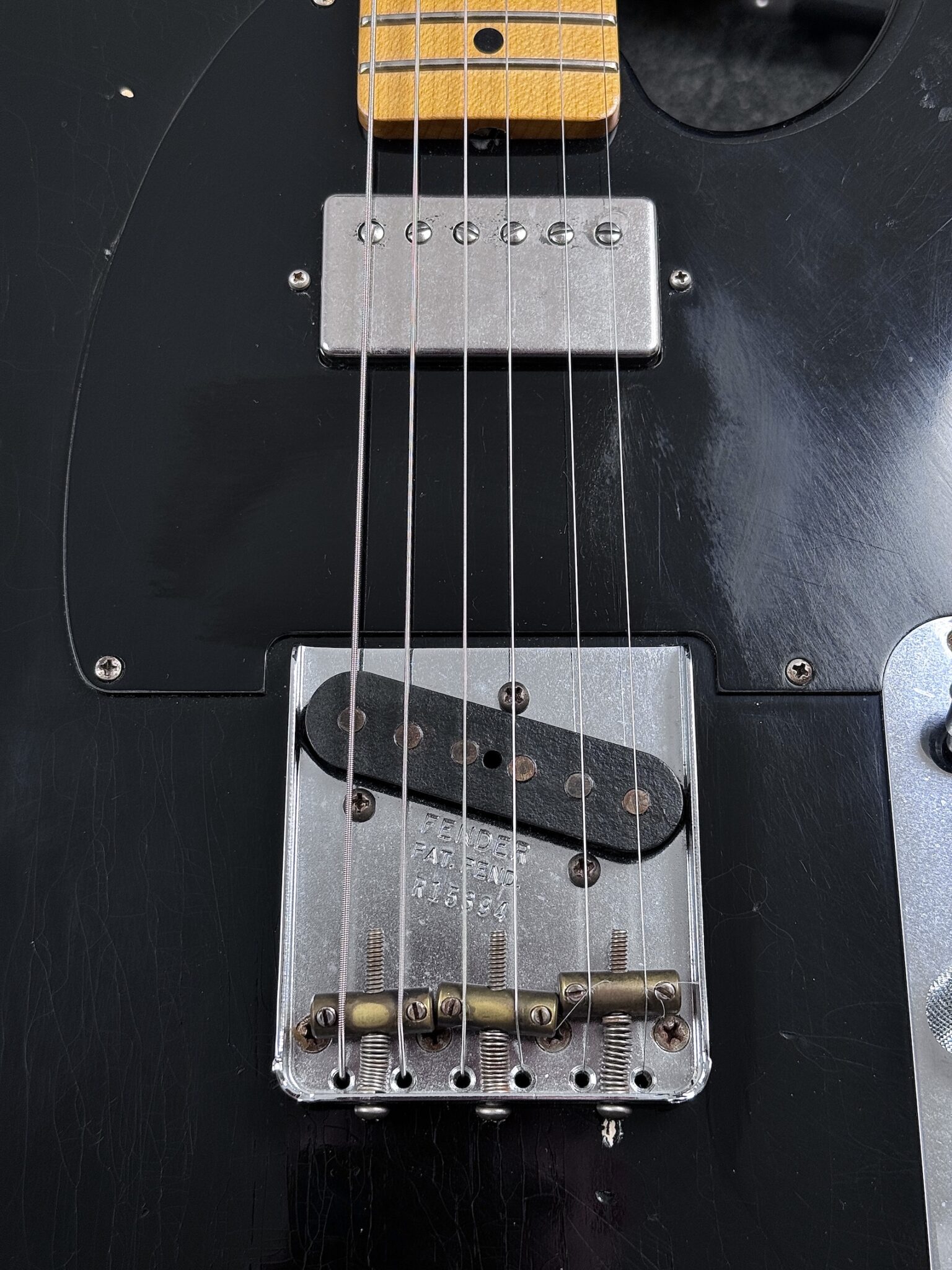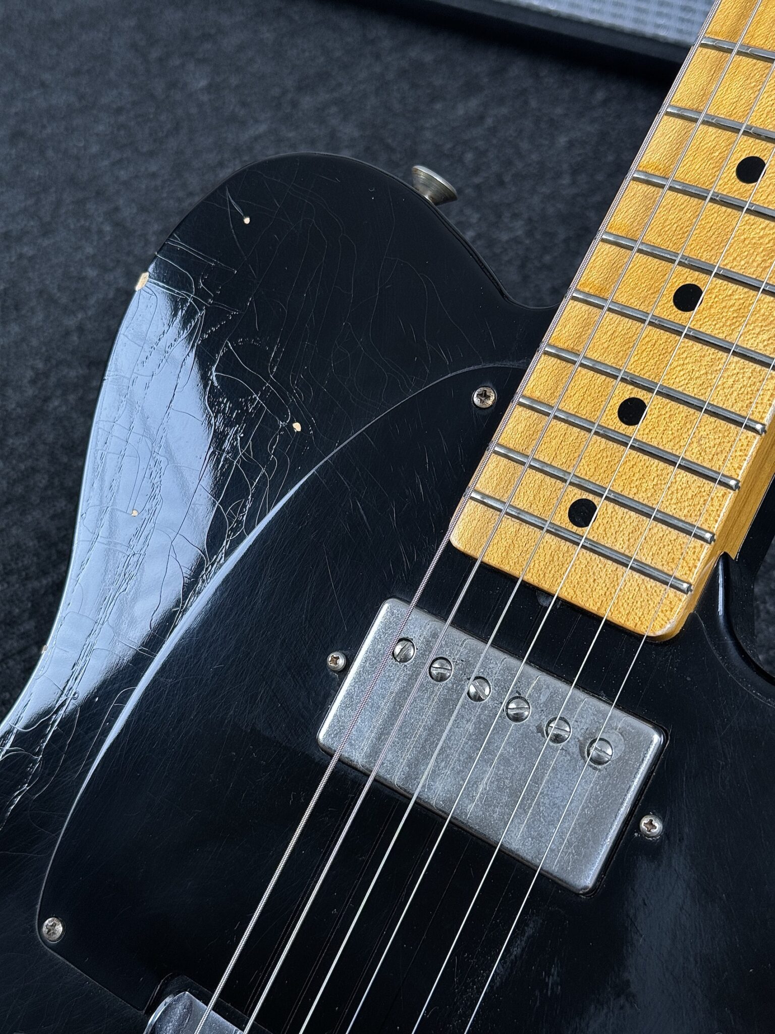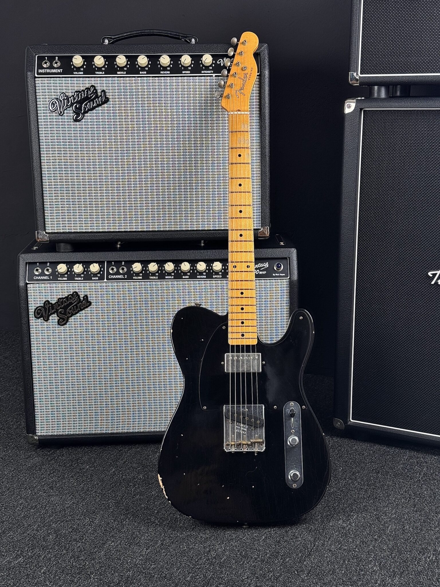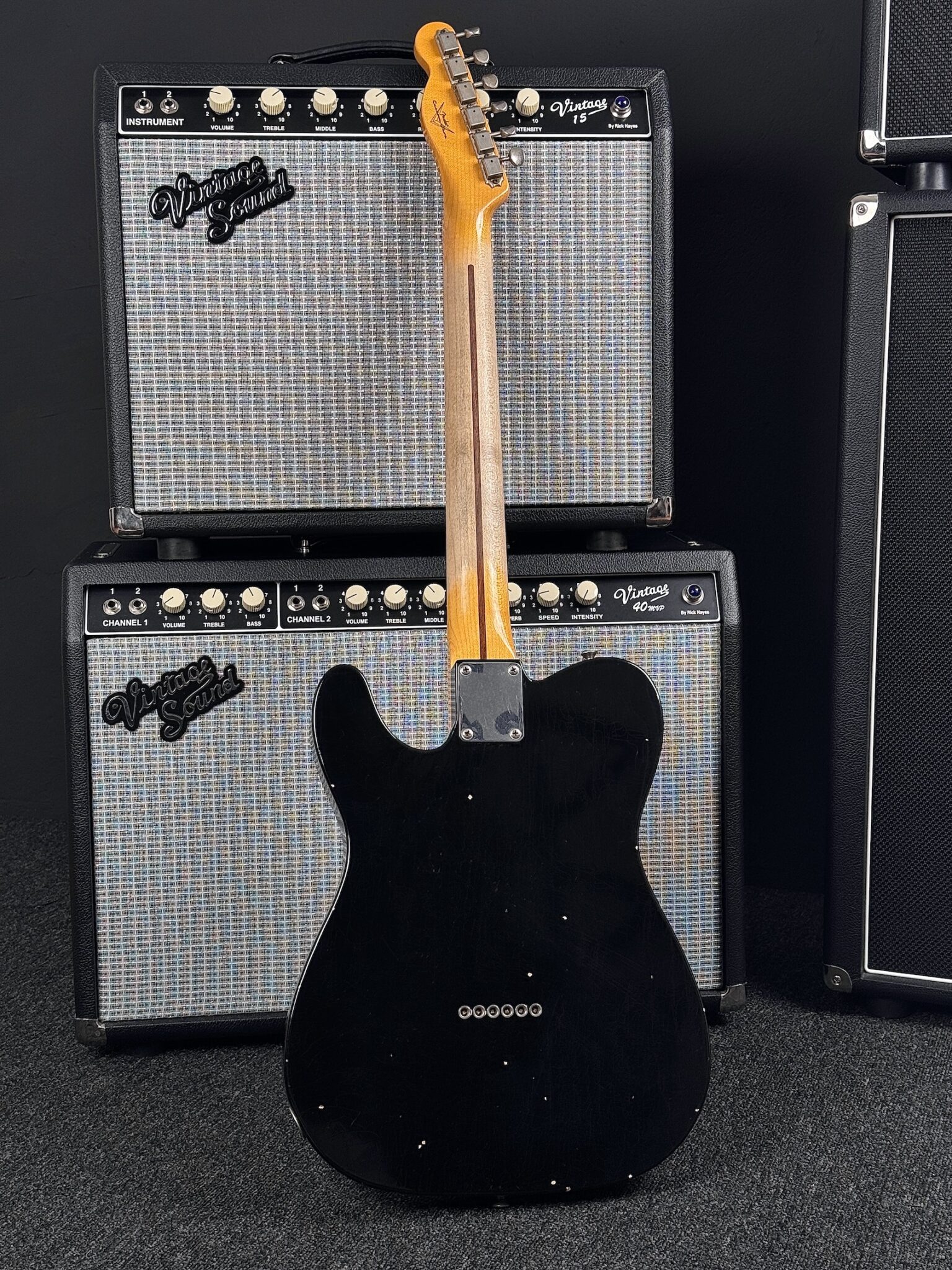 Die Tele wurde auf Kundenwunsch angefertigt – mit coolen Specs! Wir persönlich lieben schwarz und entsprechend gut gefällt uns hier auch diese Tele im authentischen Journeyman Relic Style. Das Aging ist richtig gut gemacht und sie sieht schon richtig cool aus. Der SD Humbucker klingt richtig fett und eine Tele mit Humbucker ist halt echt ne runde Sache. Sie ist mit klanglich sehr flexibel und macht irre Spaß. Der 52er „U“ Hals ist satt, aber nicht zu dick und mit 3,4kg hängt sie nicht zu schwer am Kreuz. Der 7,25“-9,5“ Compound Radius ist im Übrigen auch sehr angenehm zu spielen. Der bestellte Ace of Hearts Pin up Sticker wurde entfert, sieht besser aus ohne 🙂 Ein geniale Tele, mit der man richtig rocken kann!