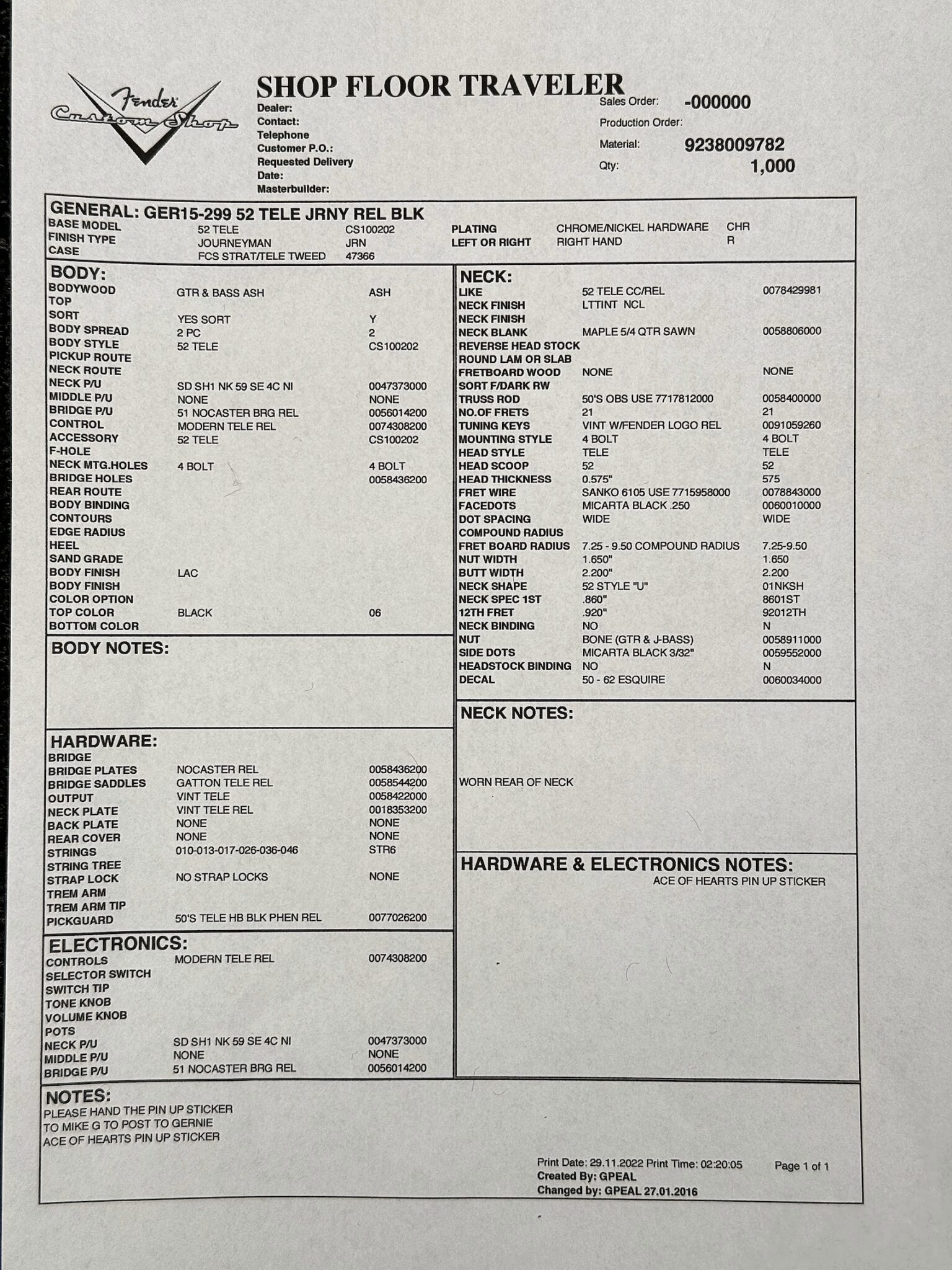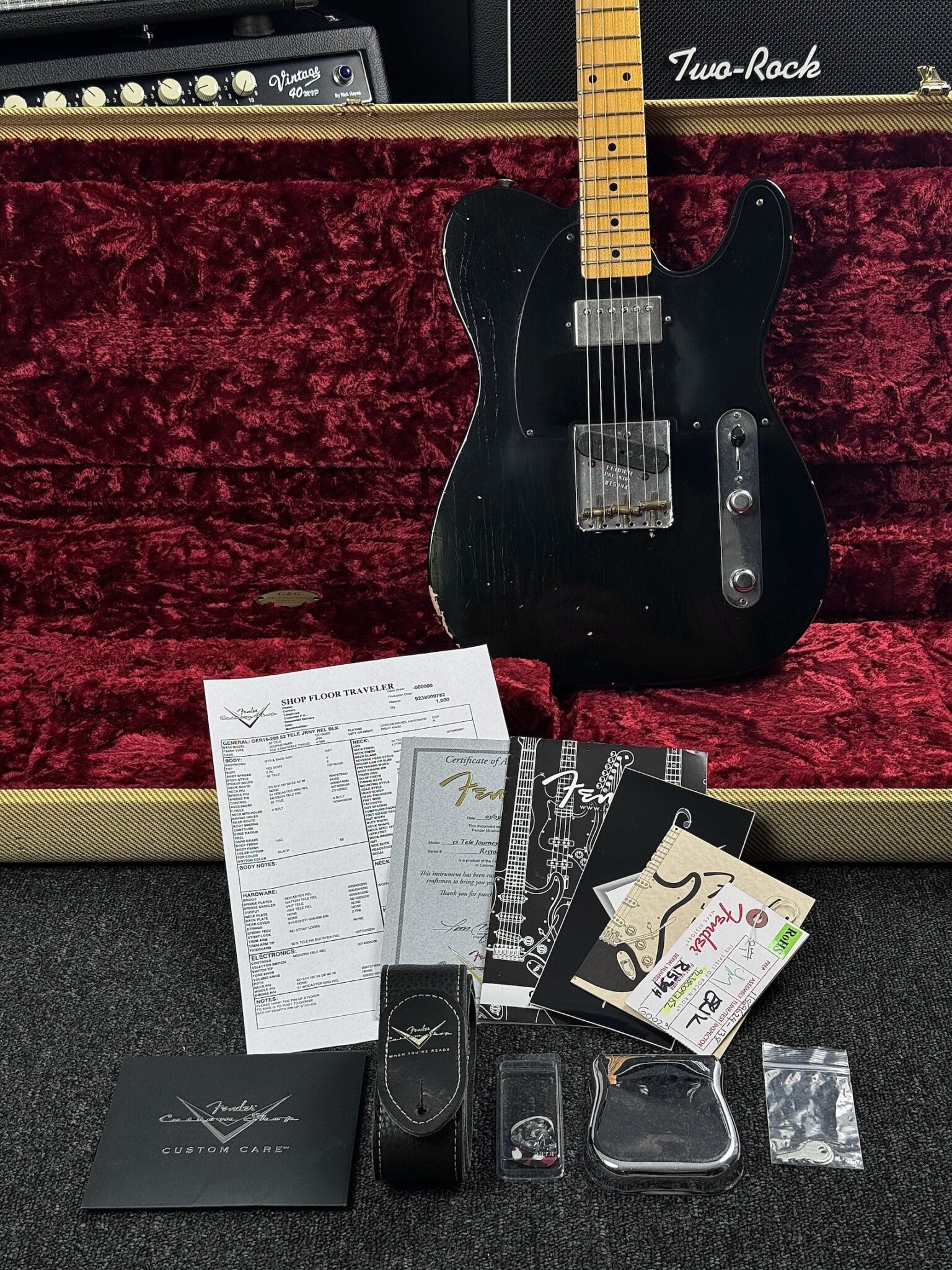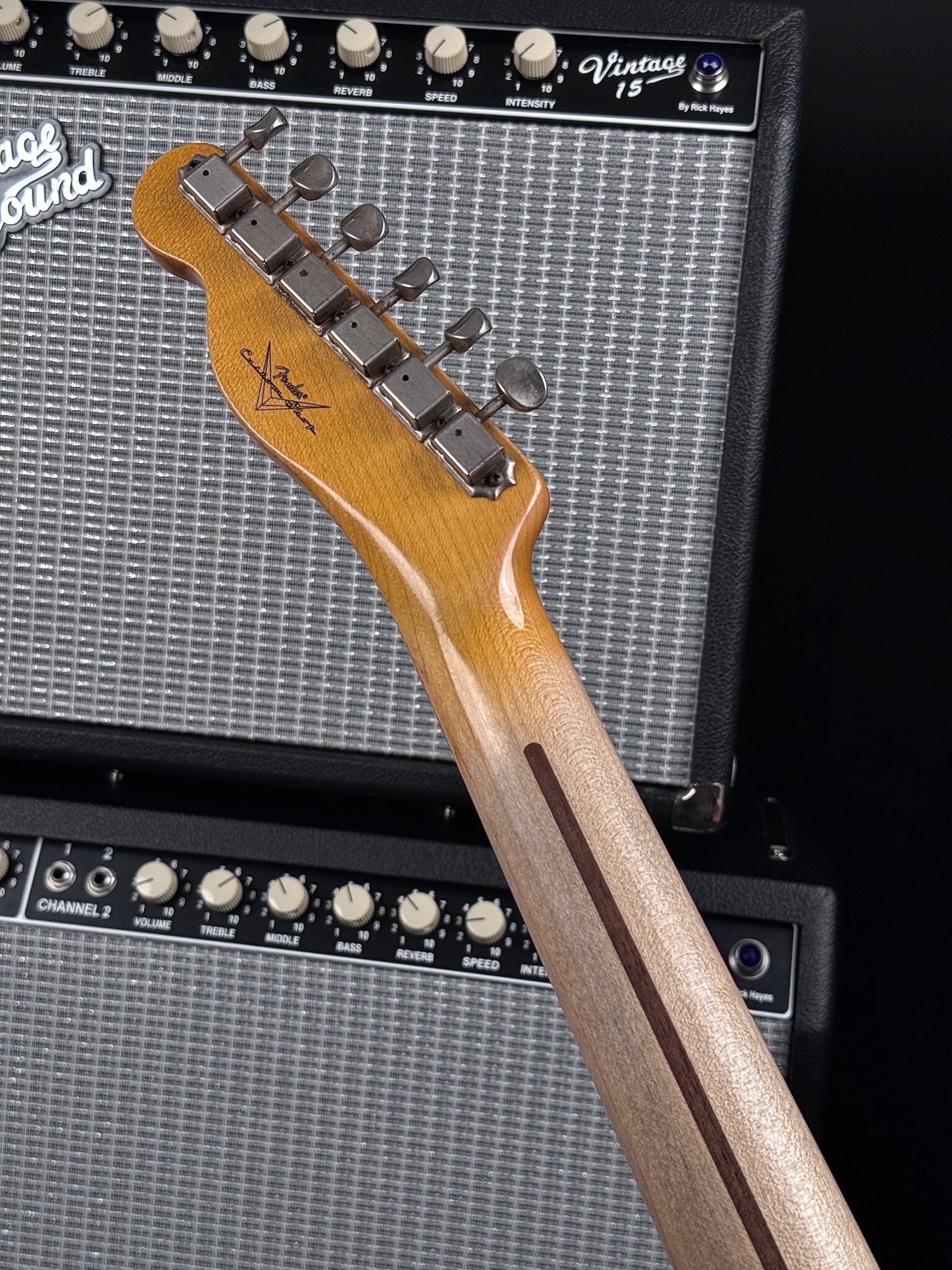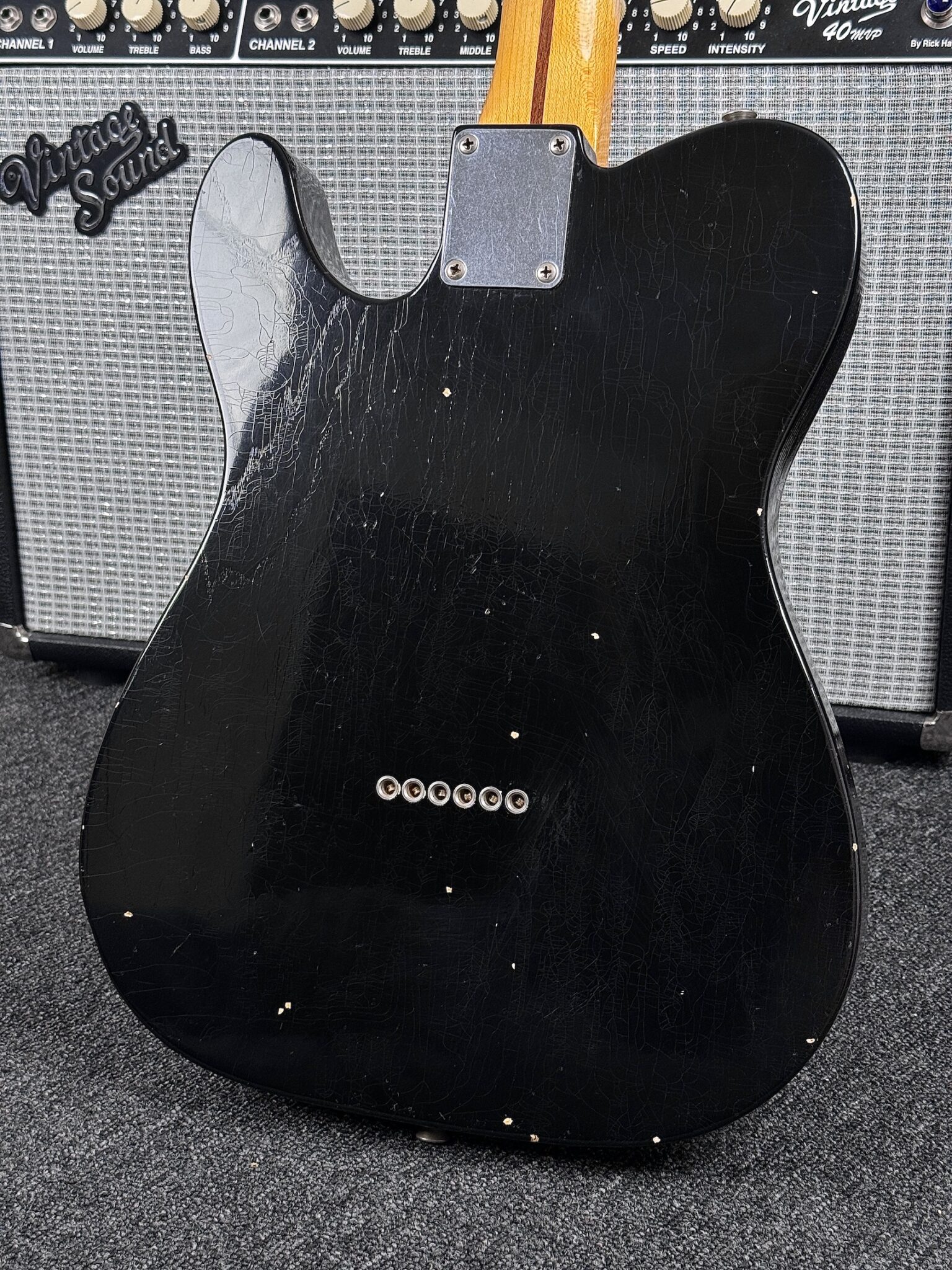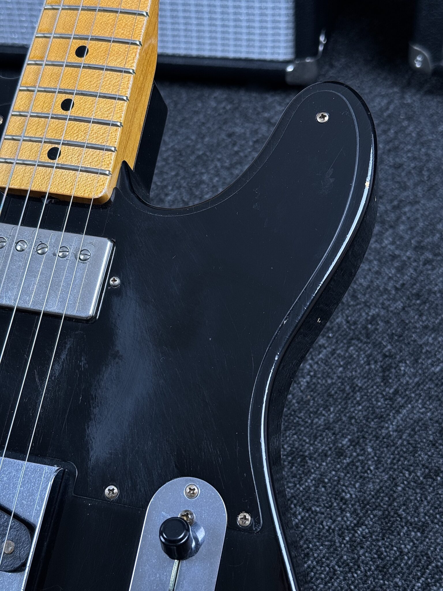 Die Tele wurde auf Kundenwunsch angefertigt – mit coolen Specs! Wir persönlich lieben schwarz und entsprechend gut gefällt uns hier auch diese Tele im authentischen Journeyman Relic Style. Das Aging ist richtig gut gemacht und sie sieht schon richtig cool aus. Der SD Humbucker klingt richtig fett und eine Tele mit Humbucker ist halt echt ne runde Sache. Sie ist mit klanglich sehr flexibel und macht irre Spaß. Der 52er „U“ Hals ist satt, aber nicht zu dick und mit 3,4kg hängt sie nicht zu schwer am Kreuz. Der 7,25“-9,5“ Compound Radius ist im Übrigen auch sehr angenehm zu spielen. Der bestellte Ace of Hearts Pin up Sticker wurde entfert, sieht besser aus ohne 🙂 Ein geniale Tele, mit der man richtig rocken kann!