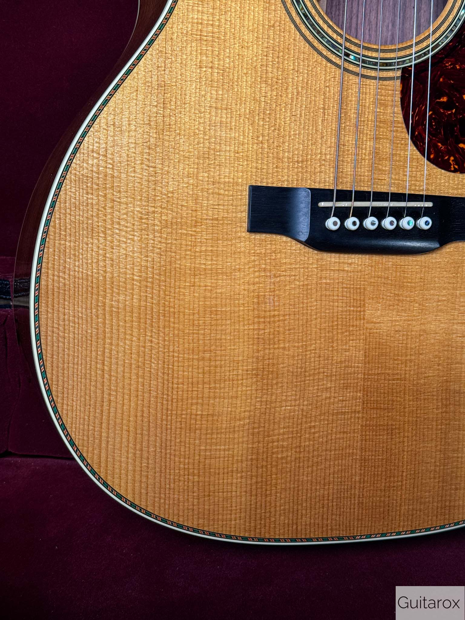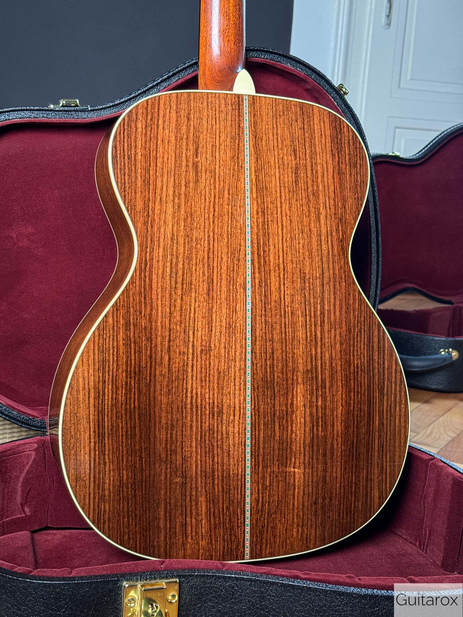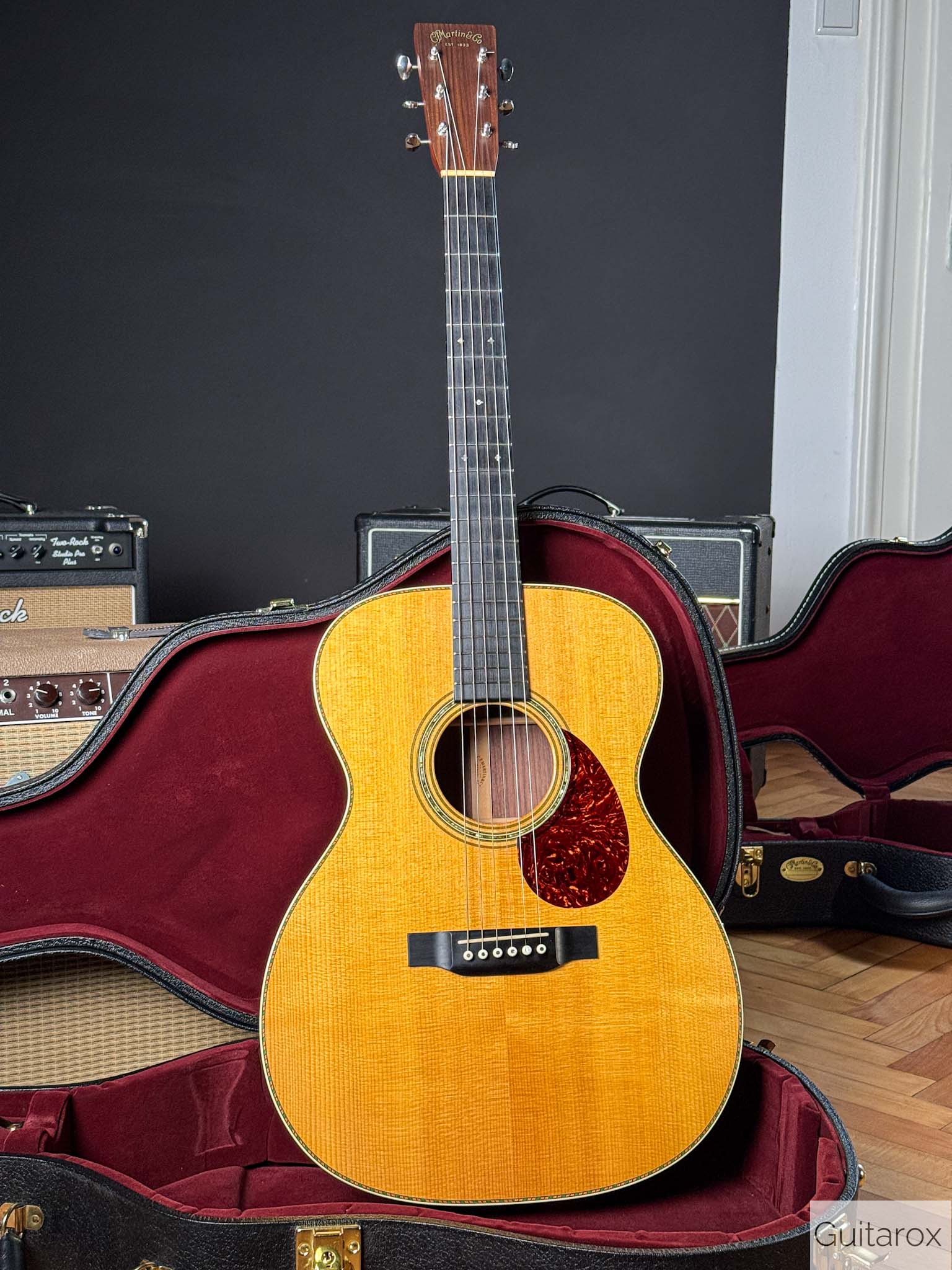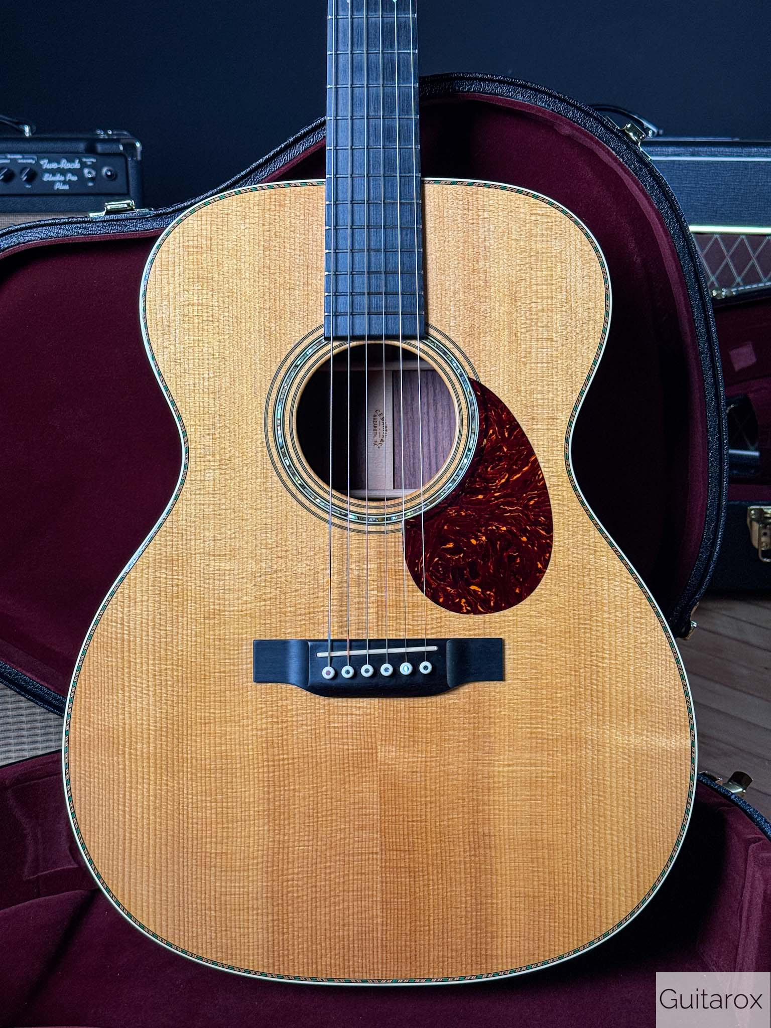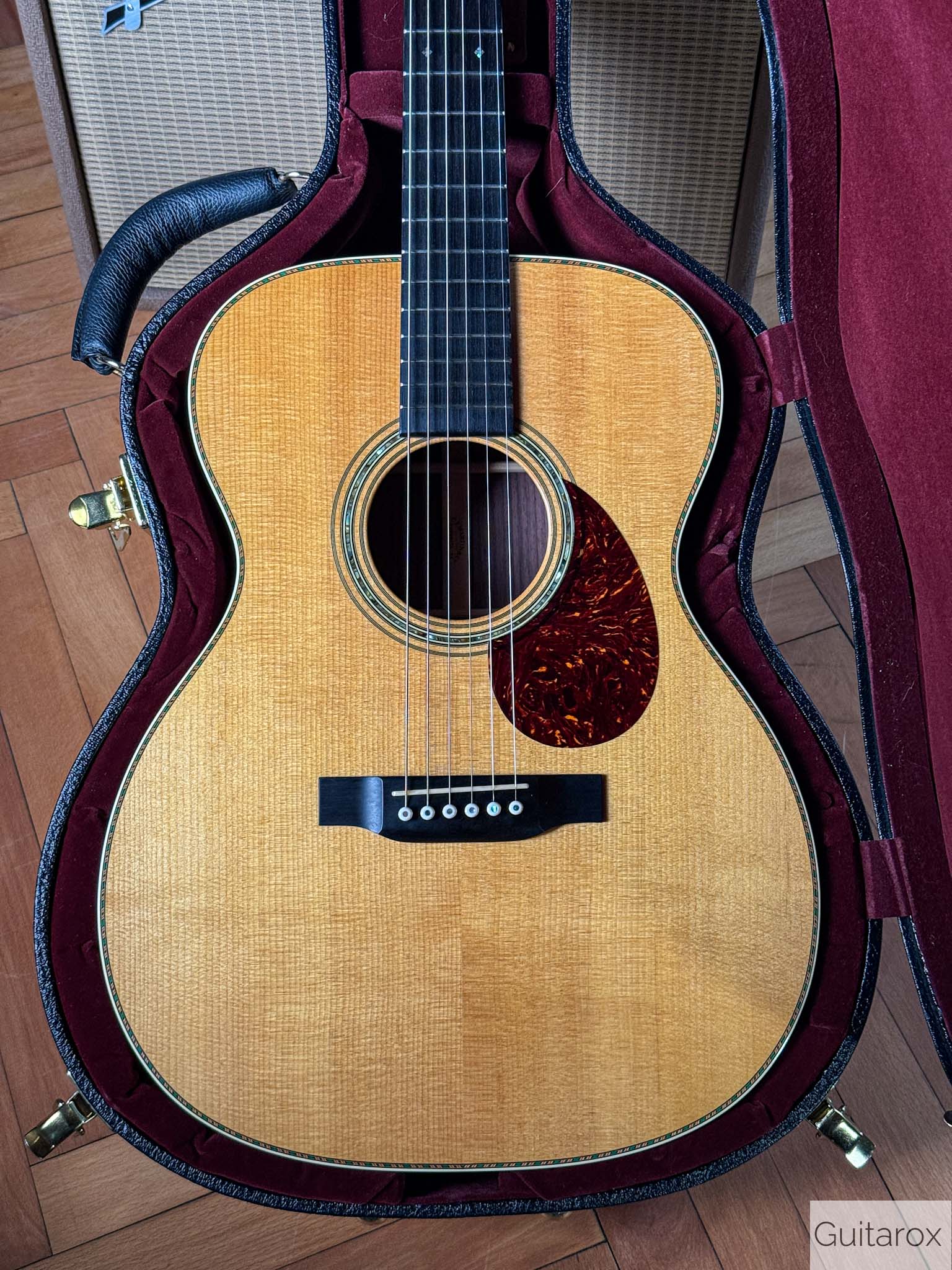 Zum Verkauf kommt diese wunderschöne 2018 Martin Ltd OM 30 Custom Shop. Die Martin wird im perfekten Bestzustand ausgeliefert, es handelt sich um ein Sammlerstück. Die OM 30 ist ein auf weltweit 20 Stück limitiertes Sondermodel aus dem Custom Shop. Diese kompakte und vollmassive Orchestra sorgt dank Handfertigung und einer besonderen Holzselektion für ein überragendes Klangbild. Dementsprechend thront in klassischer Manier eine Sitka-Fichtendecke auf einem Korpus aus ostindischem Palisander und liefert straffe und klare Bässe, nuancenreiche und markante Mitten, sowie feinsilbrige Höhen und eignet sich damit für Fingerstyle und leichtes Strumming. Zudem sorgt eine kompensierte Stegeinlage aus Knochen für eine optimale Resonanzübertragung und eine flache Saitenlage, während die verchromten Mechaniken sauber die Stimmung halten. Für den optischen Reiz wurden MOP Diamonds and Squares in Griffbrett implementiert. Der Hals hat das Low Oval Profil und hat eine mittlere Dicke und liegt demnach schön kräftig in der Hand.