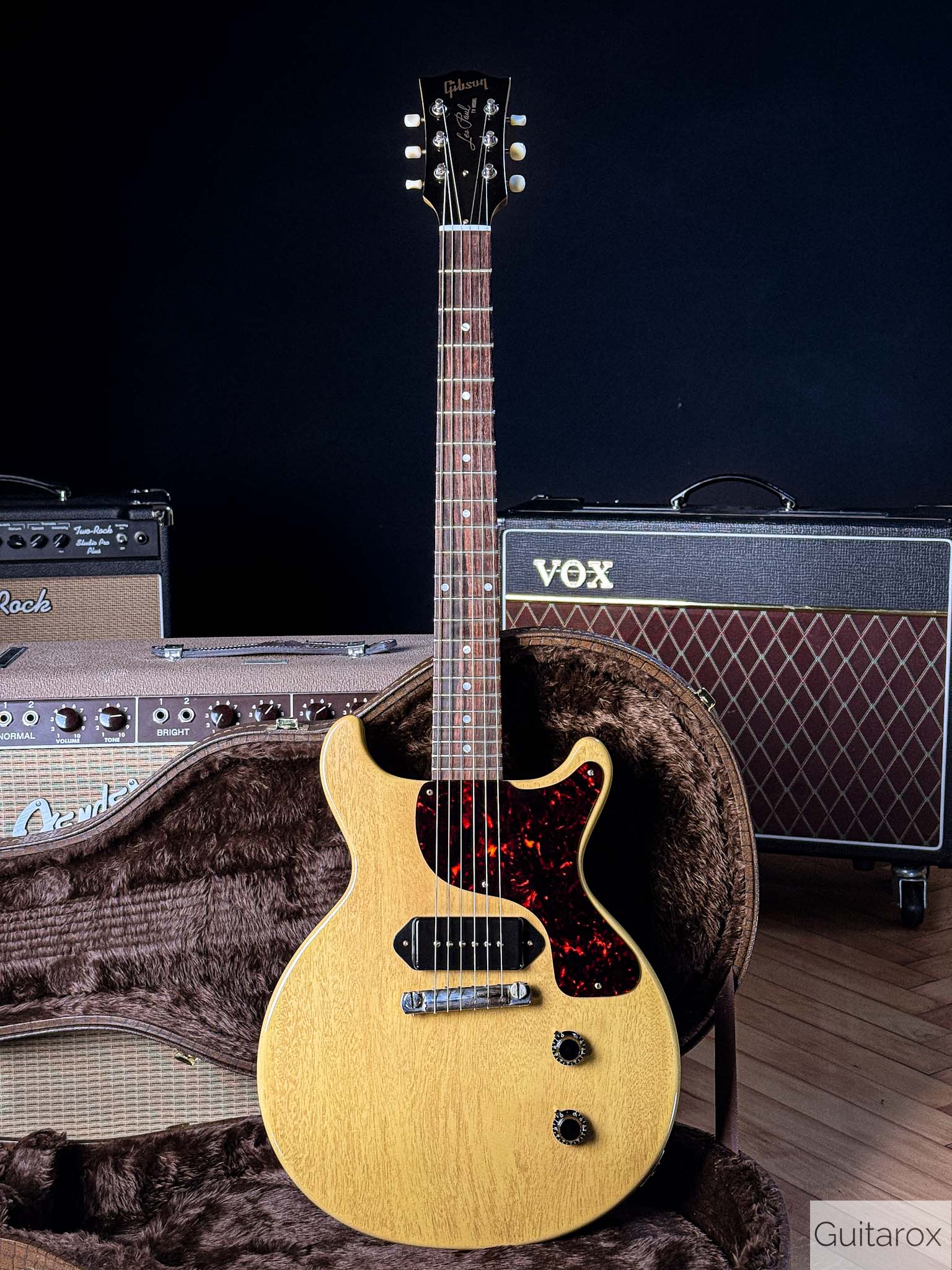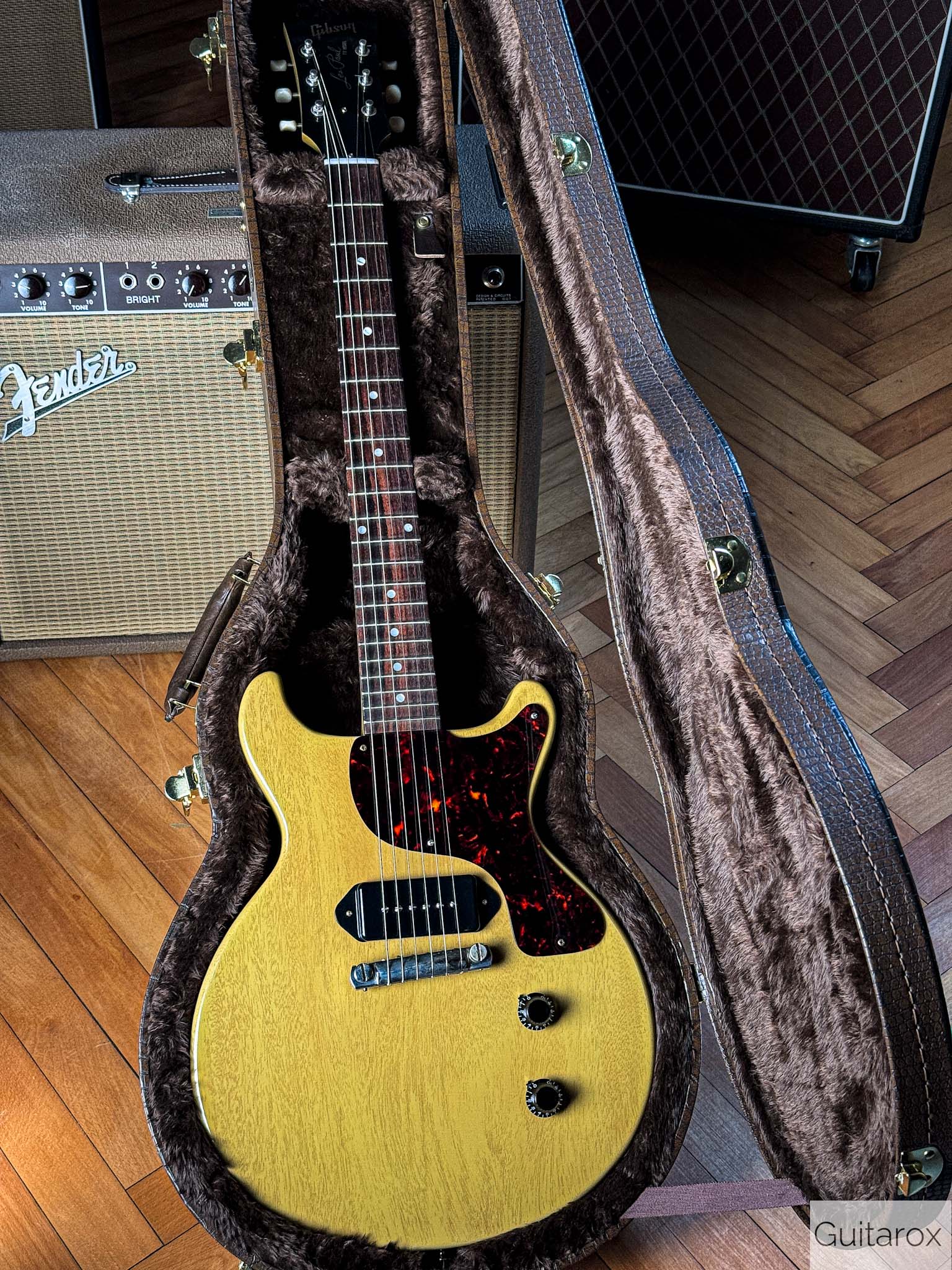 Zum Verkauf kommt diese wunderschöne 2020 Gibson 58 Les Paul Junior Doublecut TV Yellow. Die Junior stammt aus Erstbesitz und wurde fast nicht gespielt, also absoluter Top Zustand. Das einzige was man sieht, ist auf der Kopfplatte minimale Spuren vom Saitenwechseln. Auslieferung erfolgt im Gibson OHSC mit COA, Checkliste und Case Candies. Eine Junior ist halt einfach ein Spaßgerät – simpel, leicht und einfach Volle Hütte. Das erwartet man und das tut sie auch. Mit 3,1kg ist sie super klar und hat Attack. Der 57er Hals liegt kräftig in der Hand und das Handling ist allein durch die Korpus Form genial.
